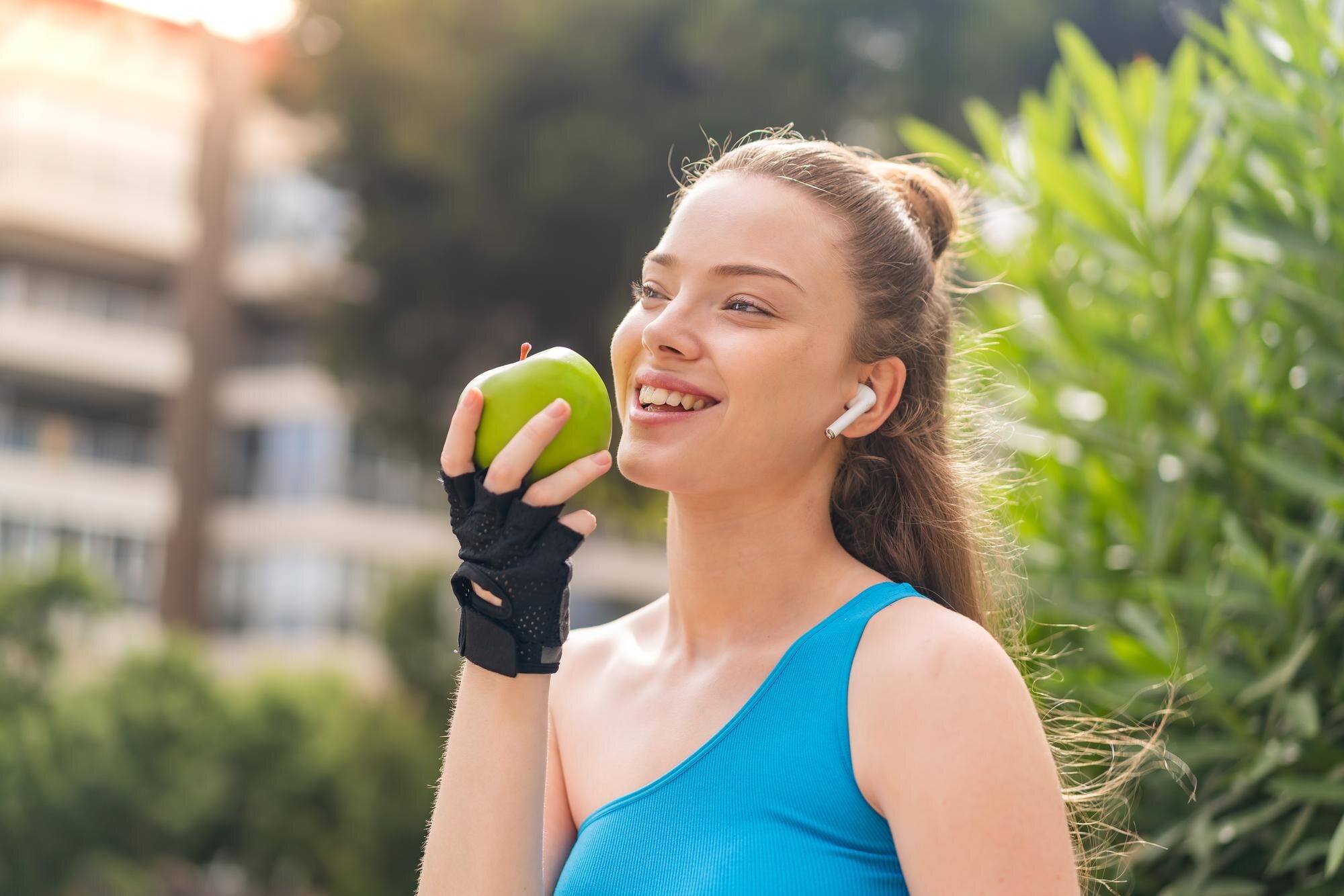 Egy egészséges mosolyú nő almát eszik.